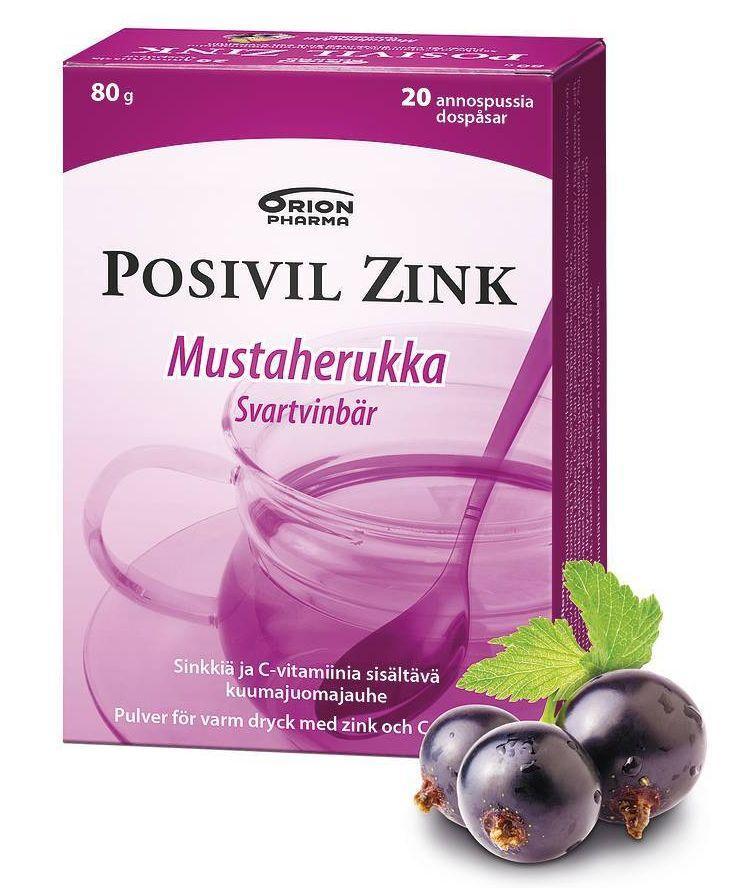 Posivil Zink Mustaherukka — это порошок для приготовления горячего напитка со вкусом черной смородины, содержащий мед, а также большое количество цинка и витамина С.